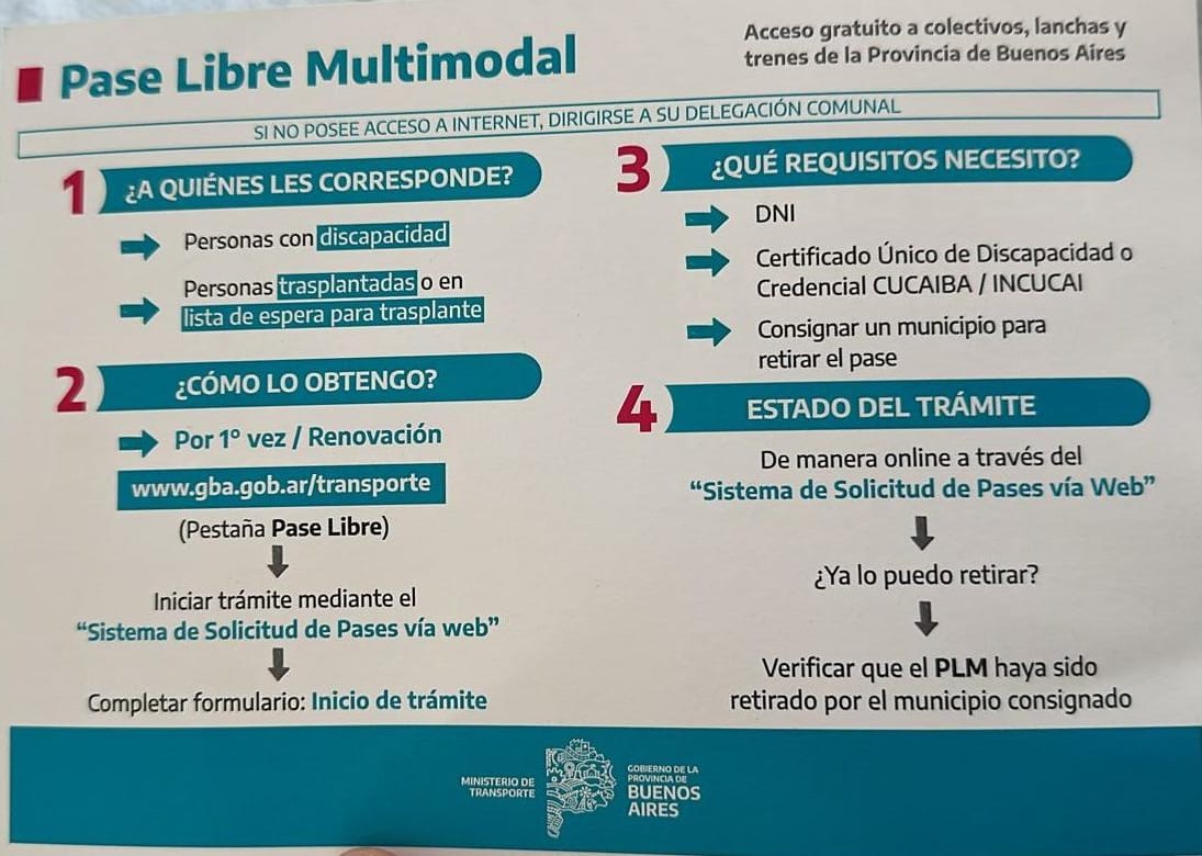 El Pase Libre Multimodal es una credencial que emite el Ministerio de Transporte de la Provincia de Buenos Aires y permite usar el transporte público de manera gratuita a personas con discapacidad, trasplantadas, o en lista de espera de trasplante.