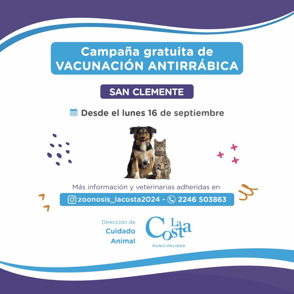 La Municipalidad de La Costa informa sobre la campaña de vacunación antirrábica para perros y gatos en veterinarias adheridas. Esta primera etapa se desarrollará en San Clemente desde el lunes 16 de septiembre, y posteriormente, se extenderá al resto de las localidades.