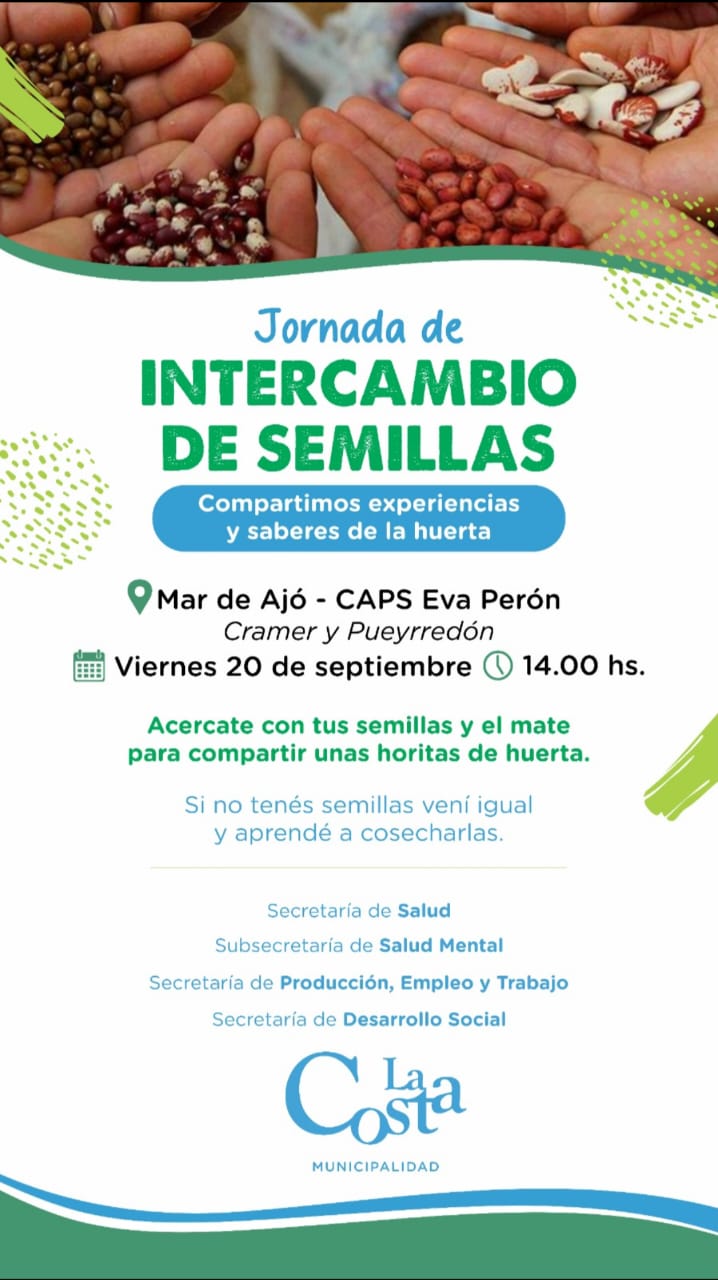 La Municipalidad de la Costa invita a la comunidad a participar el viernes 20 de septiembre a las 14.00, de una Jornada de Intercambio de semillas en el Centro de Atención Primaria de la Salud (Caps) “Eva Perón”, ubicado en Crámer y Pueyrredón, Mar de Ajó.