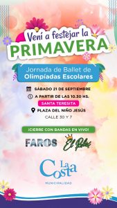 La 4ta jornada de Olimpiadas Escolares se llevará a cabo el sábado 21 a partir de las 10.30 hs en la Plaza del Niño Jesús, situada entre las calles 30 y 7 en Santa Teresita. Como cada año, la competencia de danza se celebra en conjunto con los festejos del Día de la Primavera y el Día del Estudiante.