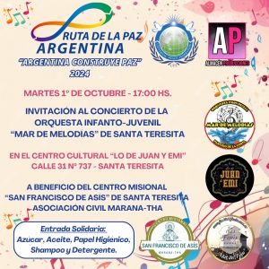El martes 1º de octubre, a partir de las 17.00, se llevará a cabo un concierto de la Orquesta Infanto-Juvenil “Mar de Melodías” en el Centro Cultural “Lo de Juan y Emi”, ubicado en la Calle 31 Nº 737 de Santa Teresita. Este evento se realiza en beneficio del Centro Misional “San Francisco de Asís”, perteneciente a la Asociación Civil Marana-Tha, y se enmarca en la campaña “Argentina construye Paz”.