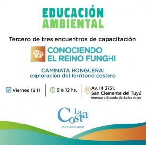 Se trata de una actividad gratuita y abierta a todo público, organizada en el marco del programa municipal de Educación Ambiental este es el tercero de tres encuentros de capacitación, y contará con una “caminata honguera” que permitirá a los participantes conocer y explorar las distintas especies de hongos de la región costera.