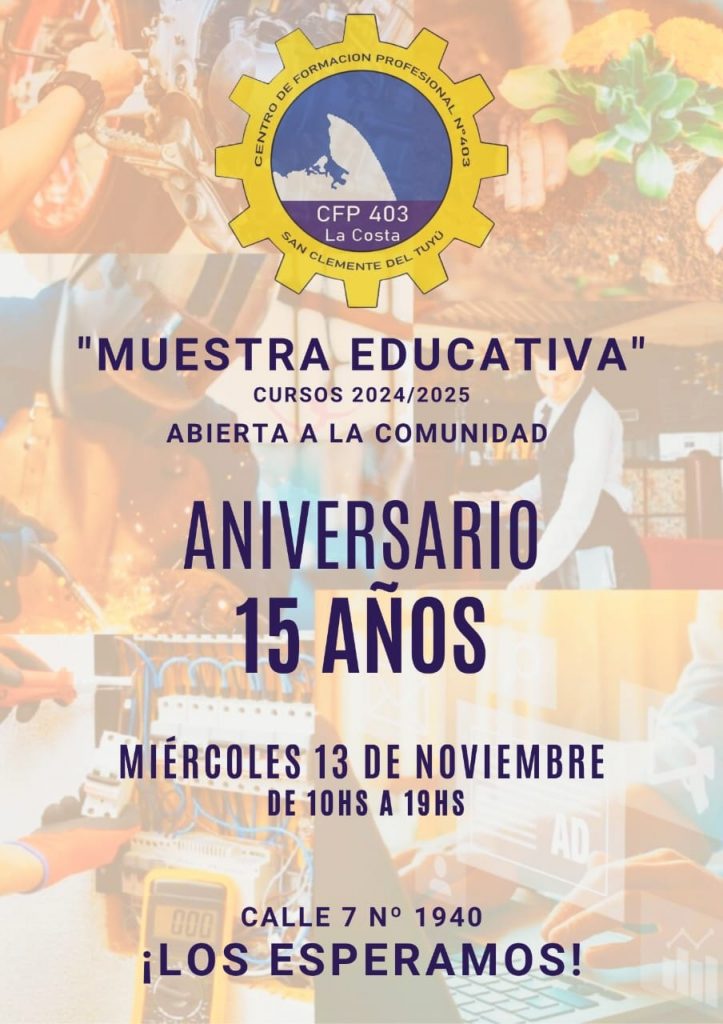 El Centro de Formación Profesional Nº 403 de San Clemente del Tuyú festejará su 15º aniversario con una muestra educativa. El evento se desarrollará este miércoles 13 de 10.00 a 19.00 en Calle 7 Nº 1940.