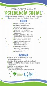 La Municipalidad de la Costa invita a participar del 2° Encuentro Regional de Psicología Social que llevará adelante el Centro PsicoSocial Argentino, el próximo sábado 23 de noviembre, en el Centro Cultural de Las Toninas, ubicado en Calle 7 N°1675.