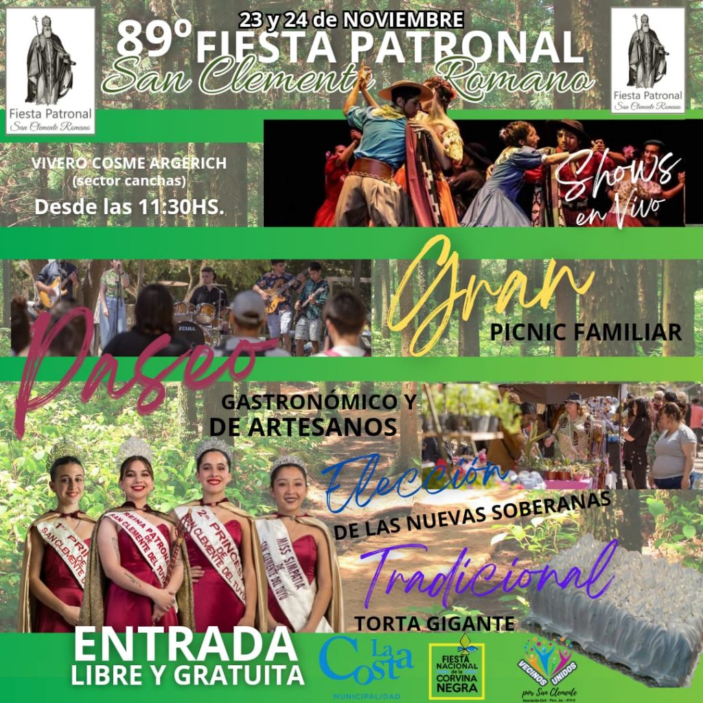 San Clemente del Tuyú se prepara para vivir la 89º edición de la Fiesta Patronal de San Clemente Romano. Las actividades se llevarán a cabo el sábado 23 y el domingo 24 desde las 11.30 en el sector de canchas del Vivero Cosme Argerich.