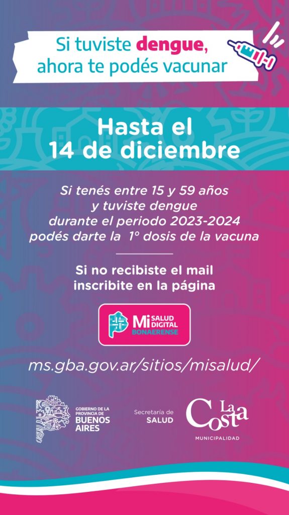 Hasta el 14 de diciembre, aquellos que ya tuvieron dengue se pueden vacunar en el Hospital Municipal de Santa Teresita. La campaña es impulsada por la Secretaría de Salud de La Costa en un trabajo articulado con el Ministerio de Salud de la Provincia de Buenos Aires.