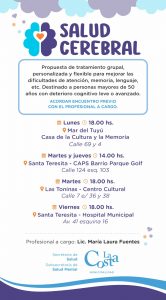 El dispositivo de Salud Cerebral trabaja de manera preventiva y está apuntado a personas que presentan algún deterioro leve o avanzado de tipo cognitivo o avanzado. La persona debe acordar un encuentro previo con la Licenciada María Laura Fuentes quien realizará una evaluación para luego determinar qué tipo de tratamiento se requiere.