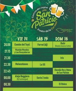 El organizador de Camino de Jaguel y de “San Patricio”, Facundo Perez, señaló: “Estamos muy contentos y a fondo con todos los preparativos de esta fiesta. Queremos invitarlos a participar, a disfrutar de toda la propuesta gastronómica y de producción de cerveza y destilados locales, en conjunto con un montón de bandas y presentaciones artísticas”.