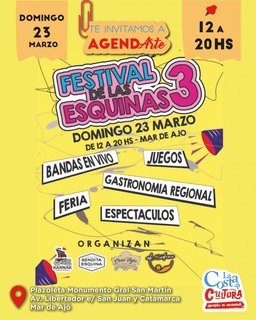 El día 23 de marzo, de 12 a 20 hs, en la Plazoleta Monumento Gral. San Martín, Av. Libertador entre San Juan y Catamarca de la localidad de Mar de Ajó se llevará a cabo el “ Festival de las Esquinas ” organizado por los bares: Karnak Café & Vermut , Bendita Esquina , Casa Vieja y El Médano; acompaña la Municipalidad de La Costa.