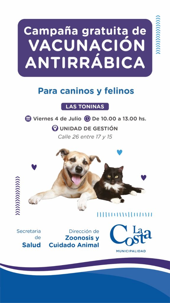 La Secretaría de Salud de la Municipalidad de La Costa, a través de la Dirección de Cuidado Animal y Zoonosis, realizará una jornada gratuita de vacunación antirrábica para perros y gatos el próximo viernes 4 de julio, de 10.00 a 13.00, en la Unidad de Gestión de Las Toninas, ubicada en calle 26 entre 17 y 15.