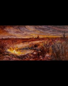 “Humedal, fulgor latente” es una pintura en acrílico sobre tela, de 41 x 77 cm, que retrata un paisaje del humedal pampeano, y resume la mirada colaborativa de los artistas sobre lo natural, lo sensible y lo que subyace en los paisajes cotidianos.