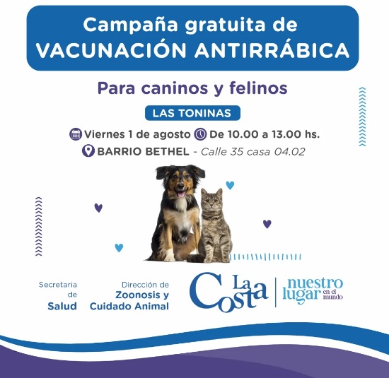 La vacunación, obligatoria y sin costo, ya se llevó adelante en varias zonas como Mar de Ajó, San Bernardo, Santa Teresita, Mar del Tuyú y Costa del Este, incluyendo operativos en delegaciones y centros comunitarios. En Las Toninas, por ejemplo, se vacunaron recientemente 222 animales en la Unidad de Gestión local. Esta semana, la jornada continuará en el barrio Betel, también en Las Toninas, el día viernes de 10 a 13 hs, donde el equipo de zoonosis estará aplicando la vacuna antirrábica a perros y gatos cumpliendo con todos los requisitos sanitarios correspondientes.