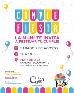 En esta oportunidad, el programa Cumple Fiesta llega el sábado 2 de agosto a Mar de Ajó. El festejo de cumpleaños se realizará de 14.00 a 17.00 en el CAPS de Mar de Ajó Norte, ubicado en Santiago del Estero y Sarmiento.