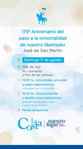 La Municipalidad de La Costa invita a la comunidad a participar del acto oficial por el 175.º Aniversario del paso a la inmortalidad del Libertador General José de San Martín, que se llevará a cabo el domingo 17 de agosto en la localidad de Mar de Ajó, en Av. Libertador y Francisco de las Carreras.