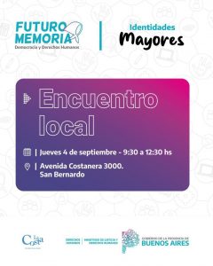 La Municipalidad de La Costa invita a participar del Encuentro Local Intergeneracional, el día jueves 4 de septiembre, desde las 9:30hs hasta las 12:30hs, en el Parador San Bernardo, ubicado en Avenida Costanera 3000, en el marco del Certamen Mayores con Derechos – 4ta Edición “Identidades Mayores” y del programa Futuro Memoria, organizado por la Subsecretaría de Derechos Humanos de la Provincia de Buenos Aires junto a la Secretaría de Desarrollo Social y Familia y la Secretaría de Educación de la Municipalidad de La Costa.
