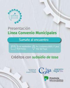 La Municipalidad de La Costa invita a productores y trabajadores con oficios a participar de la presentación de la línea Provincia Microcréditos – Convenios Municipales, un programa que fortalece proyectos locales a través de financiamiento accesible con tasas subsidiadas.