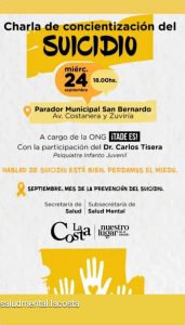 En el marco del Mes de la Prevención del Suicidio, la Subsecretaría de Salud invita a la comunidad a participar de una charla abierta de concientización, que se llevará a cabo el miércoles 24 de septiembre a las 18 hs en el Parador Municipal de San Bernardo, Av. Costanera y Zuviría.