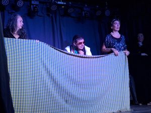 El elenco está integrado por Gabriela Marinsalta, Carlos Bron, Roxana Bergerot y Claudia Zappino, artistas con trayectoria en el circuito independiente, quienes sostienen una propuesta escénica basada en el compromiso actoral y en el vínculo directo con el espectador, que sigue la obra desde sus mesas con la posibilidad de degustar un refrigerio mientras se desarrolla la función.